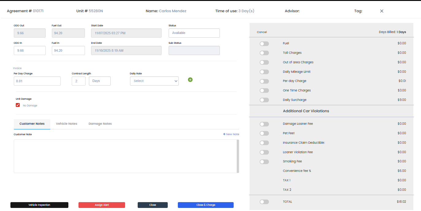 Choosing the "Close" button will put any contract that has an amount owed into a pending pay status on the dashboard that can be reviewed and modified/charged at a later time.