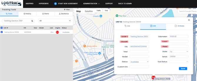 The Vehicle will now show up on the mapping section as well as the Vehicles/Devices page. This is a great time to update the: Vehicle ID, Color, Plate#, Registration Information, etc. And it's good to be loaned/tracked from here!