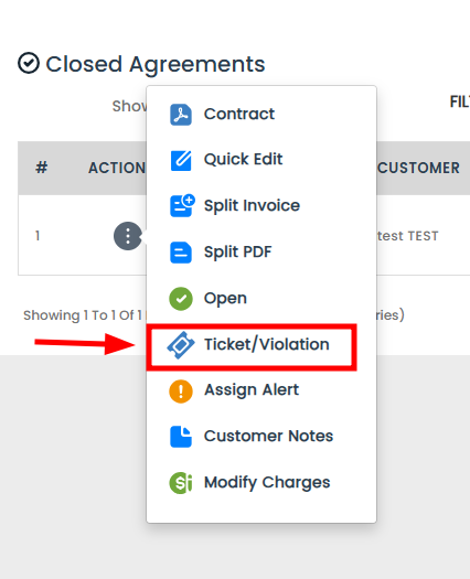 Once you locate the agreement, click the Actions button on the left-hand side and select "Ticket/Violation."