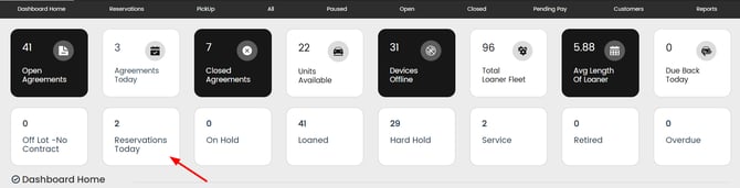 You can view existing reservations by either staying on the Reservation tab or by navigating to the Dashboard and selecting the "Reservations Today" tile.