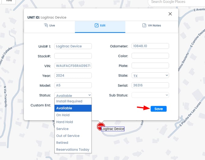 Click on the dropdown and select the desired status for the vehicle.